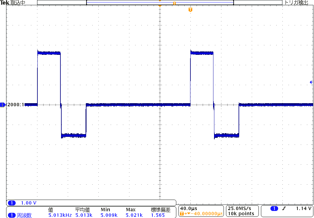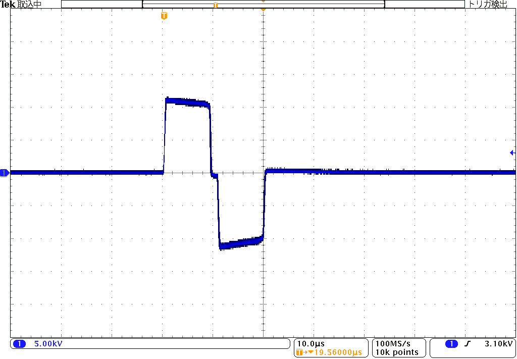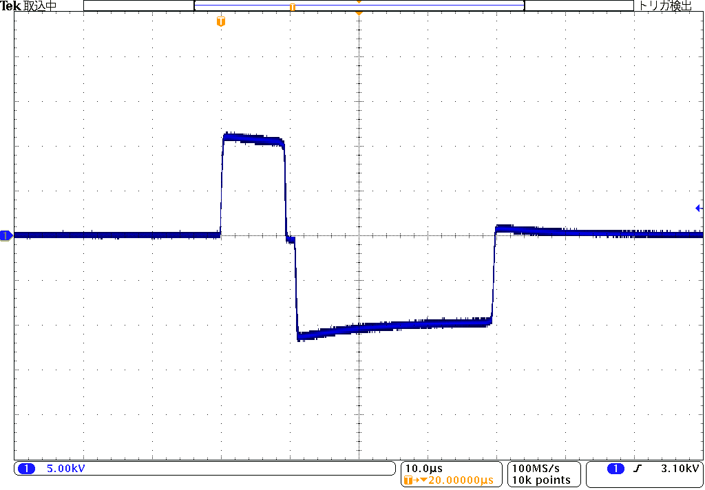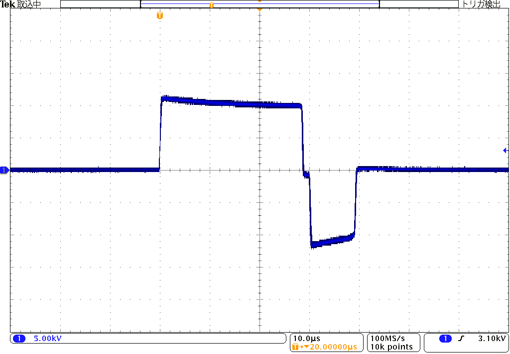 出力波形は高電圧高速スイッチング方式を採用しており、立ち上り時間および立ち下り時間が 500nsec 以下の高速な矩形波となっています。発振周波数は 1kHz ~ 10kHz の範囲で可変です。